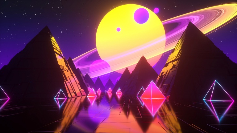 3D球体山峰月亮宇宙银河抽象星球行星环恒星金字塔4K壁纸免费下载